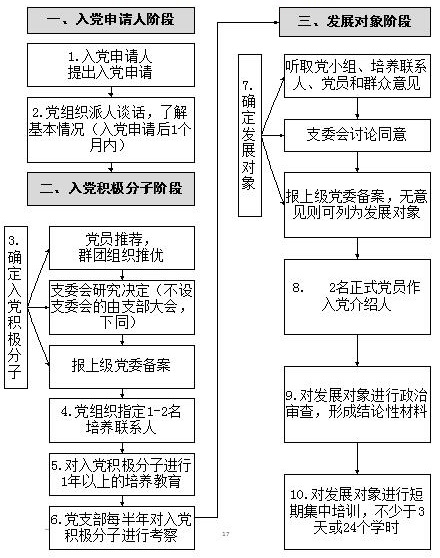 10.上级党委进行预审。预审结果以书面形式通知党支部,预审合格后发放《入党志愿书》。发展对象未来三个月内将离开工作、学习单位的,一般不办理接收预备党员的手续。