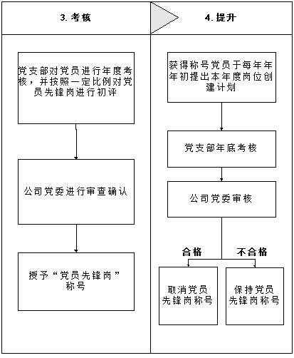 4.提升。获得“共产先锋岗”称号的党员,应于次年初提出更高的创建目标和工作计划,并积极予以落实。党支部和上级党委同样于年底对其进行考核评定。考核合格的继续保持“党员先锋岗”称号,考核不合格的则取消称号。